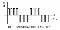 常規(guī)電磁流量計所應用的低頻方波勵磁方式的勵磁電流頻率通常為工頻的1/4~1/10。目前深井(6000m以上)的固井施工中所使用泥漿的密度大多在1.8g/cm³以上,流速高達25m/s,所用的泥漿又是固液兩相低導率流體,雖然高壓下能消除非牛頓流體所帶來的測量誤差,但測量管內會產生隨流量增加而頻率增加的隨機干擾噪聲。經測定,在DN50測量管內,所用的泥漿密度為2.0g/cm³,流速在10~15m/s范圍內,測量管內的流動噪聲主要為尖峰狀的泥漿流噪聲,量級在mv級,頻率集中在25Hz以下,如圖1所示。在勵磁頻率較低時,泥漿干擾的數(shù)量級較大,高頻時干擾數(shù)量級較小,具有1/f的頻譜特性。另外,施工現(xiàn)場敲擊和震動所帶來的低頻噪聲,也會影響電磁流量計的計量精度。提高勵磁電流頻率可以規(guī)避和抑止這些干擾,以提高電磁流量傳感器輸出的信噪比,但會犧牲電磁流量計的零點穩(wěn)定性。本文提出新的一種勵磁方式,采用雙頻矩形波作為勵磁信號。其勵磁電流波形是在低頻矩形波上疊加高頻矩形波,用兩種采樣頻率分別得到高頻和低頻兩種流量信號。如圖2所示,高頻部分是80Hz的矩形波,外包絡線是10Hz的低頻矩形波。這樣,能克服單一低頻矩形波勵磁存在的泥漿流動噪聲,同時又能保證零點的穩(wěn)定性,提高流量計的計量穩(wěn)定性和響應速度。
