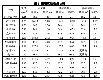現(xiàn)場試驗所用測量管的內徑為DN50,通過高壓由壬接入泥漿管線,并串接渦輪流量計進行比較,采用標準計量罐測試。計量鉆井泥漿密度范圍為1.15g/cm³~2.50g/cm³,固井設計施工現(xiàn)場一次性替漿量為18m³~160m³,替漿瞬時流量為0.2m³/min~2.8m³/min(流速:1.6~23.8m/s);通過近15口井的施工應用,結果如表1所示。試驗表明儀表計量誤差小于1%;在流速2.0m/s以下,隨著流量的減少測試誤差逐漸提高,在流速1.0m/s左右計量精度降到3%左右。經分析,主要是由零點漂移引起的,這點與實驗室用清水標定結果基本吻合。使用DN50的測量管,實驗室標定結果如表2所示。試驗證明,采用雙頻矩形波作為勵磁信號,可有效地規(guī)避和抑止固井泥漿的流動噪聲和現(xiàn)場震動等所帶來的低頻噪聲,從而顯著提高儀表計量泥漿的精度。