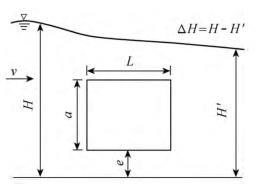 有限水域的浮體結(jié)構(gòu)在不同來流動水中運行時,浮體結(jié)構(gòu)位置的改變會對流場產(chǎn)生影響,從而影響浮體結(jié)構(gòu)的泄流能力以及穩(wěn)定性。試驗過程中固定浮體結(jié)構(gòu)的體型不變(長L=0.20m,寬B=0.30m,高a=0.10m),分別選取4種不同來流流量Q及浮體結(jié)構(gòu)位置e,控制浮體結(jié)構(gòu)在上、下游水位不變的條件下進行試驗,具體試驗參數(shù)設(shè)計及說明見表1以及圖2。