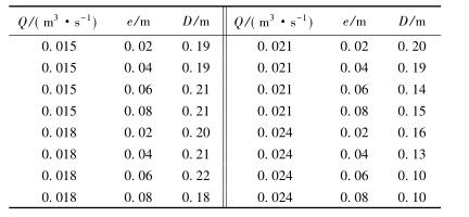 表3中,當(dāng)來流流量較小時(Q=0.015m3/s),回流區(qū)的長度D隨著浮體結(jié)構(gòu)位置的增大逐漸增大;當(dāng)來流流量較大時(Q=0.024m3/s),回流區(qū)的長度卻隨著浮體結(jié)構(gòu)位置的增大呈現(xiàn)減小的趨勢。試驗過程中,當(dāng)浮體結(jié)構(gòu)位置較高且來流較小時,浮體結(jié)構(gòu)上下部區(qū)域的主流流速較小,回流區(qū)范圍較大;浮體結(jié)構(gòu)位置不變時,來流流量增大,回流區(qū)長度減小。來流增加,下泄水流流速較大,并迅速將回流區(qū)內(nèi)的水流帶入下游區(qū)域,因此回流區(qū)長度反而呈現(xiàn)減小趨勢。