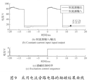 實驗結(jié)果表明,高壓源向低壓源切換后,三端穩(wěn)壓器的工作特性致使的電流波動和低壓源供電情況下的恒流控制,會大幅延長勵磁電流的穩(wěn)態(tài)響應(yīng)時間。圖8所示勵磁電流約在17ms左右進入穩(wěn)態(tài),圖9所示勵磁電流的穩(wěn)態(tài)響應(yīng)時間約為12ms。這表明,在采用三端穩(wěn)壓器搭建恒流控制電路的情況下,電流旁路電路能有效克服三端穩(wěn)壓器工作特性的影響,并能方便的實現(xiàn)電流超調(diào),加快勵磁電流的響應(yīng)速度。