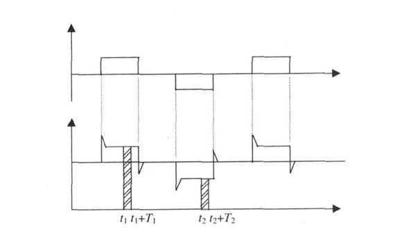 硫酸流量計一般都采用工頻交流電源供電, 其電源電壓的幅值和頻率的變化都會給硫酸流量計帶來電源性干擾噪聲。對電源電壓的幅值變化, 因采用多級集成穩(wěn)壓, 一般而言電源電壓的幅值變化對電磁流量的測量精度影響不大。當(dāng)電源電壓的頻率波動時, 雖然其波動范圍有限, 但對硫酸流量計測量精度影響較大。為了解決工頻干擾問題, 實(shí)現(xiàn)對流體流速感應(yīng)電勢eab信號的準(zhǔn)確測量, 需利用以下基本關(guān)系:①勵磁周期為工頻周期的整數(shù)倍, 即勵磁頻率為50/nHz(n為偶數(shù));②正負(fù)勵磁下的同相位采樣。圖2是對應(yīng)低頻矩形波勵磁形式下的典型電勢信號形式, 按上述關(guān)系在一個勵磁周期下, 若假設(shè)t1 和t2 點(diǎn)為工頻干擾的等效干擾點(diǎn), 且采樣寬度T=T1 =T2 , 則eab的基本算式為: