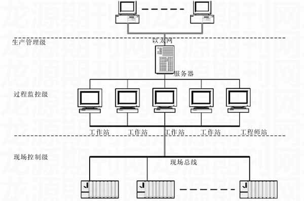 針對鎢礦選廠生產(chǎn)的實際需求,這里應用相應的自動化技術,對自動化監(jiān)控系統(tǒng)進行了設計。在系統(tǒng)設計中,遵循“方案合理、技術先進、運行可靠、操作方便”的原則,系統(tǒng)整體采用集散控制系統(tǒng),基于現(xiàn)場總線通訊,其整體網(wǎng)絡構(gòu)架如下: