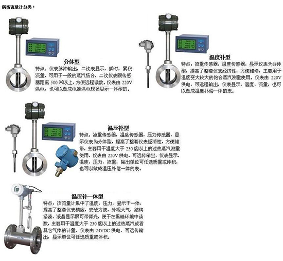 渦街流量計(jì)與現(xiàn)場顯示儀組合后,成為智能一體化流量計(jì),分別用于飽和蒸汽流量計(jì)量、過熱蒸汽流量計(jì)量、各種化學(xué)氣體流量計(jì)量和各種液體流量計(jì)量。