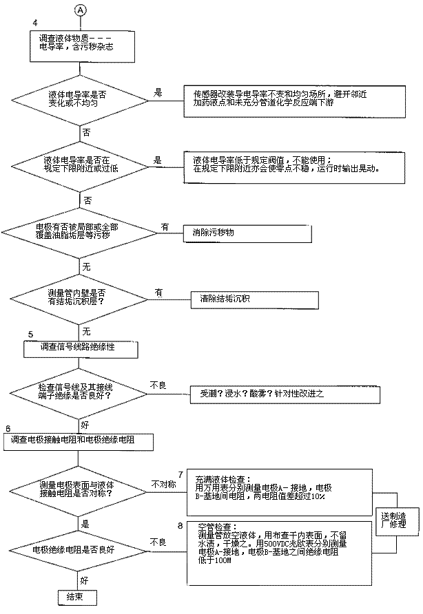 檢查流程圖*5項(xiàng)。信號(hào)回路絕緣下降會(huì)形成零點(diǎn)不穩(wěn)。信號(hào)回路絕緣下降的土要原因足,包極部位絕緣下降所引起的,但也不能排除信號(hào)電纜及其接線端子絕緣下降或破壞。因?yàn)橛袝r(shí)候現(xiàn)場(chǎng)環(huán)境十分嚴(yán)酷,稍一疏忽儀表蓋、導(dǎo)線連接處密封不慎,彌漫著潮氣酸霧或粉粒塵埃侵入儀表接線盒或電纜保護(hù)層,使絕緣卜降。信號(hào)回路絕緣電阻檢查分別按電纜側(cè)和流量傳感器側(cè)兩郵分進(jìn)行,用兆歐表測(cè)試。因信號(hào)電纜容易可先做。流量傳感器再分兩次進(jìn)行:充滿液體測(cè)黽電極表面接觸電阻和個(gè)管后測(cè)量,U極絕緣電阻。