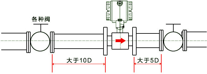 1、對(duì)直管段的要求:必須水平安裝在管道上(管道傾斜在5以內(nèi)),安裝時(shí)流量計(jì)軸線應(yīng)與管道軸線同心,流向要一致。上游管道長(zhǎng)度應(yīng)有不小于2D的等徑直管段,如果安裝場(chǎng)所充許建議上游直管段為20D、下游為5D。
