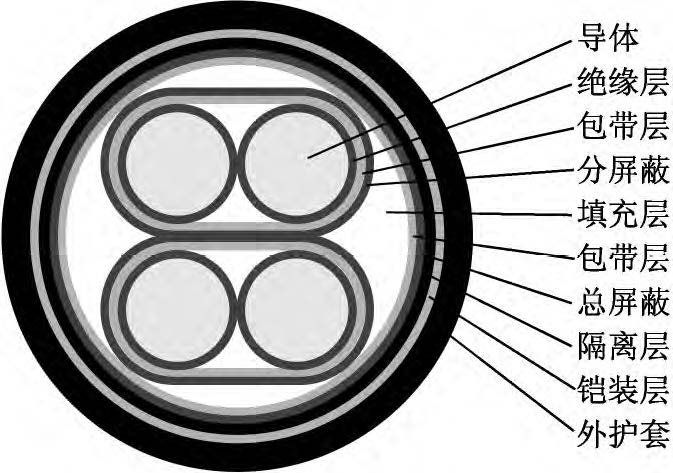 該新型電纜的結(jié)構(gòu)如圖1所示。導(dǎo)體為單股退火鍍錫軟銅線,以提高導(dǎo)體的導(dǎo)電性和防腐蝕性。在導(dǎo)體外繞包一層薄F4(聚四氟乙烯)半導(dǎo)電帶,有利于降低導(dǎo)體和絕緣之間的摩擦起電噪音。絕緣采用材料較為純凈、介電常數(shù)較小、具有一定彈性的聚丙烯絕緣級材料,并采用擠壓式擠出,減小絕緣層與導(dǎo)體的間隙。采用對絞組作為信號傳輸線,由于在兩根傳輸線上感應(yīng)的電壓接近相等,減小了電壓差值,提高了信號傳輸穩(wěn)定性;對絞組由兩種不同顏色絕緣線芯組成,相鄰線對對絞節(jié)距應(yīng)不大于100mm。對絞分屏蔽組(即對對絞組進(jìn)行分屏蔽,每對對絞組外繞包兩層聚酯帶和一層厚0.04mm鋁塑復(fù)合帶繞包,內(nèi)置一根7×0.26mm鍍錫銅絞線作引流線)有利于對不同對絞組之間信號串音的抑制和隔離。對絞分屏蔽組同心式絞合成纜,在對絞分屏蔽組間填充非吸濕性材料,以保證纜芯圓整。在成纜纜芯外繞包兩層聚酯帶,再采用鋁塑復(fù)合帶繞包,內(nèi)置鍍錫銅線作引流線,以提高電纜電磁屏蔽能力。總屏蔽層外擠包隔離層(隔離護(hù)套),隔離層采用絕緣級低密度聚乙烯材料。隔離層外采用鎧裝層,鎧裝材料為高導(dǎo)磁合金鋼帶,其為強磁材料,可將外來的磁通大部分限制在鎧裝層的外表面上(僅有少部分能進(jìn)入被屏蔽的空間);鎧裝時對高導(dǎo)磁合金鋼帶采用縱包焊接,確保其形成一連續(xù)圓柱管;鎧裝層可提高電纜抗電磁干擾水平以及對電纜進(jìn)行加強,減少電纜振動引起的電動勢。外護(hù)套采用藍(lán)色軟PVC(聚氯乙烯)護(hù)層級電纜材料擠包,實現(xiàn)電纜防護(hù)。