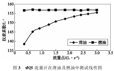 依據(jù)表3測試數(shù)據(jù),經計算可得,Φ25流量計在滑油及燃油中測試結果如表4所示,測試線形圖如圖3所示。