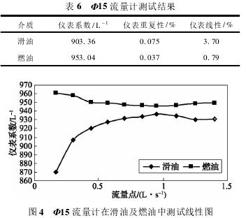 依據(jù)表5測試數(shù)據(jù),經計算可得,Φ15流量計在滑油及燃油中測試結果如表6所示,測試線性圖如圖4所示。