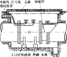 由于大口徑管道在多數(shù)場(chǎng)合下是埋在地下的,因此大口徑傳感器在安裝前應(yīng)做好水泥地坑。圖6-19所示是在給排水系統(tǒng)中常見(jiàn)的安裝形式。水泥地坑應(yīng)有足夠的活動(dòng)空間,側(cè)壁埋有敷設(shè)電纜的鋼管,上有蓋板防止雨淋,下有泄水管以免坑內(nèi)積水而使傳感器侵水。為了拆裝方便,傳感器應(yīng)放在墊腳上,且在下游側(cè)裝有活絡(luò)的伸縮管。圖6-20是測(cè)量鹽水流量計(jì)在地下水泥管污水排放系統(tǒng)中的安裝實(shí)例。