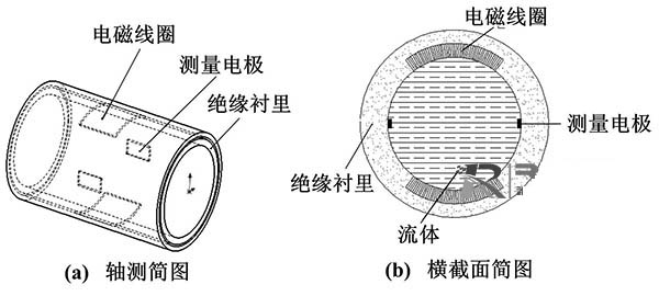 ③利用阻抗或信號(hào)衰減研制的非滿管一寸管污水流量計(jì)。這種結(jié)構(gòu)的非滿管一寸管污水流量計(jì)是當(dāng)前國(guó)內(nèi)研究的方向之一。其結(jié)構(gòu)是流量管底部貼一對(duì)信號(hào)發(fā)射電極,在流量管中間貼信號(hào)接收電極。由于信號(hào)在流體中傳播會(huì)產(chǎn)生衰減,且傳播時(shí)間越長(zhǎng),衰減越多,因此通過(guò)信號(hào)接收電極接收到的信號(hào)衰減量即可得知液面高度;同時(shí)該電極還能測(cè)量流體切割磁感線產(chǎn)生的電動(dòng)勢(shì),以此達(dá)到測(cè)量非滿管流量的目的。阻抗式或信號(hào)衰減非滿管一寸管污水流量計(jì)結(jié)構(gòu)簡(jiǎn)圖如圖5所示。