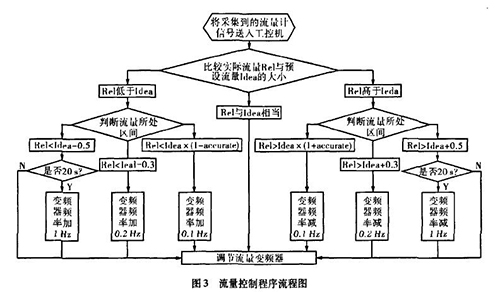實際生產(chǎn)中流量一直在某個區(qū)域內(nèi)波動,且其動態(tài)特性不易掌握。從上面的理論中我們能夠讓誤差△£盡可能的小,這樣距我們所需要的理論值%就越接近。而減小誤差需要我們把n取的盡可能大,也就是在生產(chǎn)時間內(nèi)劃分更多的周期去調(diào)節(jié)流量。當工控機根據(jù)工業(yè)污水印染廢水流量計傳送回來的信號發(fā)出調(diào)節(jié)變頻器工作頻率的指令后,電機調(diào)整功率到工業(yè)污水印染廢水流量計的實際測量為一個工作周期,我們知道從指令發(fā)送到實際測量值返回有一個較大的滯后,如果調(diào)節(jié)的周期時間小于流量計本身的一個工作周期,那么顯然不可能達到減小誤差的目的。利用模糊控制思想H。,在控制程序中我們把流量的波動區(qū)域劃分為±缸×Yo,Yo-t-O.3,Yo±0.5四個區(qū)域,其中缸為可調(diào)節(jié)的誤差范圍,生產(chǎn)中我們?nèi)?.015,流量區(qū)域劃分的單位均為t/h。針對不同的區(qū)域采取不同的調(diào)整方案。具體流程如圖3所示。圖中變量Rel表示實際測量的流量,變量Idea表示理論流量。