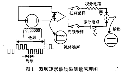 雙頻矩形波勵磁測量原理如圖l所示,一個(gè)由高低頻分量迭加而成的電磁場通過勵磁線圈被施加到被測液體中,勵磁波形是在一個(gè)低頻矩形波上迭加一個(gè)高于市電頻率的矩形波而得到的波形。在產(chǎn)生的電動勢中,低頻分量通過一個(gè)大時(shí)間常數(shù)的積分電路獲得一個(gè)零點(diǎn)穩(wěn)定性好的平穩(wěn)流量信號。而由漿液或低電導(dǎo)率流體產(chǎn)生的低頻噪聲可被不受噪聲影響的高頻采樣電路所抑制,有著同樣時(shí)間常數(shù)的流量信號經(jīng)過一個(gè)差分電路以確定流速信號的變化,把這兩種不同頻率采樣所得的信號結(jié)合起來可獲得一個(gè)穩(wěn)定流速信號,該信號不受噪聲干擾,且有較高的零點(diǎn)穩(wěn)定性。