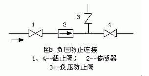 氟塑料襯里傳感器須謹慎地應(yīng)用于負壓管系;正壓管系應(yīng)防止產(chǎn)生負壓,例如液體溫度高于室溫的管系,關(guān)閉傳感器上下游截止閥停止運行后,流體冷卻收縮會形成負壓,應(yīng)在傳感器附近裝負壓防止閥,如圖3所示。有制造廠規(guī)定PTFE 和PFA 塑料襯里應(yīng)用于負壓管系的壓力可在200C、1000C、1300C時使用的絕對壓力必須分別大于27、40、50KPa。