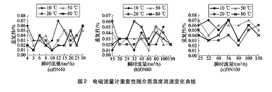 將實驗測得的水處理流量計在不同溫度及流速下的重復(fù)性數(shù)據(jù)整理,特性曲線如圖2所示,3組曲線分別對應(yīng)DN40, DN80, DN100的3塊水處理流量計的重復(fù)性曲線。