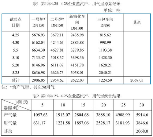 (1)綜上數(shù)據(jù),圖表可看出煙氣流量計測量飽和蒸汽,流量數(shù)據(jù)顯示清晰,穩(wěn)定可靠,其產(chǎn)、用氣量隨著流量計的完善,其差值變小了,也即使用部門越多,其消耗越少。
