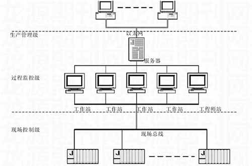 針對(duì)鎢礦選廠生產(chǎn)的實(shí)際需求,這里應(yīng)用相應(yīng)的自動(dòng)化技術(shù),對(duì)自動(dòng)化監(jiān)控系統(tǒng)進(jìn)行了設(shè)計(jì)。在系統(tǒng)設(shè)計(jì)中,遵循“方案合理、技術(shù)先進(jìn)、運(yùn)行可靠、操作方便”的原則,系統(tǒng)整體采用集散控制系統(tǒng),基于現(xiàn)場(chǎng)總線(xiàn)通訊,其整體網(wǎng)絡(luò)構(gòu)架如下: