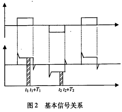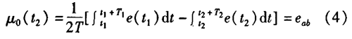冷凍水計(jì)量表一般都采用工頻交流電源供電,其電源電壓的幅值和頻率的變化都會(huì)給冷凍水計(jì)量表帶來(lái)電源性干擾噪聲。對(duì)電源電壓的幅值變化,因采用多級(jí)集成穩(wěn)壓,一般而言電源電壓的幅值變化對(duì)電磁流量的測(cè)量精度影響不大。當(dāng)電源電壓的頻率波動(dòng)時(shí),雖然其波動(dòng)范圍有限,但對(duì)冷凍水計(jì)量表測(cè)量精度影響較大。為了解決工頻干擾問(wèn)題,實(shí)現(xiàn)對(duì)流體流速感應(yīng)電勢(shì)e柚信號(hào)的準(zhǔn)確測(cè)量,需利用以下基本關(guān)系:①勵(lì)磁周期為工頻周期的整數(shù)倍,即勵(lì)磁頻率為50/nHz(n為偶數(shù));②正負(fù)勵(lì)磁下的同相位采樣。圖2是對(duì)應(yīng)低頻矩形波勵(lì)磁形式下的典型電勢(shì)信號(hào)形式,按上述關(guān)系在一個(gè)勵(lì)磁周期下,若假設(shè)t。和t:點(diǎn)為工頻干擾的等效干擾點(diǎn),且采樣寬度T=T1=T2,則e –ab的基本算式為:,