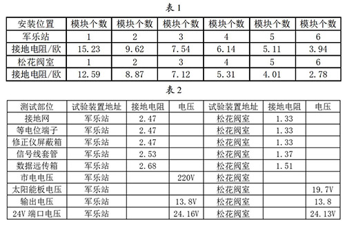 接地網的安裝與連接:接地網是整個色拉油流量計防雷試驗比較關鍵的一個內容,能不能準確的論證試驗的有效性,必須保證接地網達到標準的接地電阻,通過對實地地電阻率的測試,初步選擇6個接地模塊埋設并配用降阻劑使用,邊安裝邊測試直到達到標準值后才引入等電位箱。在軍樂站和松花閥室安裝模塊并測試數據見表1。
