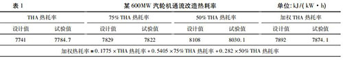 隨著火電機(jī)組利用小時(shí)數(shù)降低,發(fā)電企業(yè)一般都會(huì)根據(jù)不同負(fù)荷工況下的實(shí)際運(yùn)行小時(shí)數(shù),確定機(jī)組熱耗率考核權(quán)重,形成*終的加權(quán)熱耗率考核值。考核加權(quán)熱耗率對(duì)設(shè)備廠家末級(jí)葉片選型、高壓調(diào)門與高壓缸匹配性提出了更高的要求,在當(dāng)前負(fù)荷率偏低的情況下增強(qiáng)了發(fā)電企業(yè)的競(jìng)爭(zhēng)力。然而,僅僅對(duì)加權(quán)熱耗率進(jìn)行考核是不夠的,設(shè)備廠家為了增強(qiáng)自身的競(jìng)爭(zhēng)力,往往會(huì)把全部重點(diǎn)放在如何降低占比大的低負(fù)荷熱耗率上而犧牲高負(fù)荷的熱耗率,這無(wú)疑削弱了發(fā)電企業(yè)的適應(yīng)性。某廠一臺(tái) 600MW 汽輪機(jī)通流改造時(shí)僅對(duì)加權(quán)熱耗率進(jìn)行考核,THA 熱耗率要高出設(shè)計(jì)值43. 7 kJ/( kW·h) ,詳見表 1。通流改造時(shí)既要對(duì)加權(quán)熱耗率進(jìn)行考核,也要對(duì) THA工況時(shí)熱耗率進(jìn)行考核。