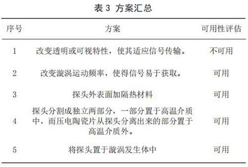 3)查找沖突矩陣,得到如下發(fā)明原理:No.32 改變顏色、No.19 周期性作用、No.24 中介物。方案一:依據(jù)No.32 改變顏色發(fā)明原理,得到解如下:改變透明或可視特性,使其適應(yīng)信號傳輸。方案二:依據(jù) No.19 周期性作用,得到解如下:改變漩渦運動頻率,使得信號易于獲取。方案三:依據(jù) No.24中介物,得到解如下:探頭外表面加真空絕熱材料。