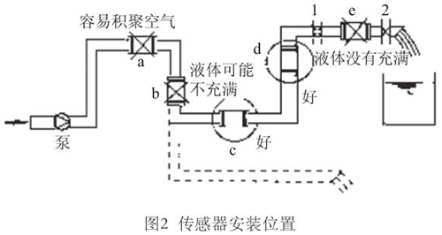 液體流動(dòng)方向必須與傳感器殼體上箭頭方向一致。對于能正反向測量的智能電磁流量計(jì),若方向不一致雖仍可測量,但設(shè)定的顯示流動(dòng)正反方向不符,必須改正之。若拆傳感器工作量大,也可改變傳感器上箭頭方向和重新設(shè)定顯示儀表符號(hào)。管道未充滿液體主要是管網(wǎng)工程設(shè)計(jì)或傳感器安裝位置不妥,使傳感器測量管內(nèi)不能充滿液體。應(yīng)采取措施,避免安裝如圖2所示a,e位置和以虛線管排放時(shí)b位置,改裝到c,d位置。