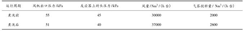 煤氣流量計(jì)煮洗吹掃后,裝置運(yùn)行期間無(wú)燃爆事故,且裝置運(yùn)行的風(fēng)量明顯提高,系統(tǒng)阻力明顯降低,投料量增加?,F(xiàn)將煮洗前后的運(yùn)行數(shù)據(jù)對(duì)比如下: