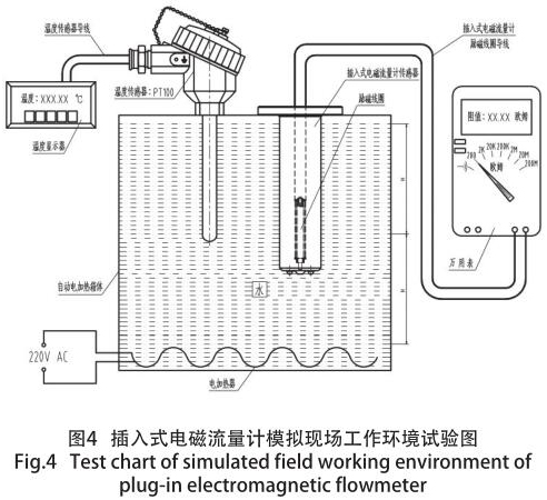 其原因是:勵(lì)磁線圈的阻值及匝數(shù)是按照常溫狀態(tài)下進(jìn)行設(shè)計(jì)的,而含有勵(lì)磁線圈的電磁流量計(jì)經(jīng)常是高于常溫狀態(tài)下進(jìn)行安裝、使用(如:高爐回水、供熱管道等),勵(lì)磁線圈的阻值隨使用環(huán)境溫度的變化而變化,致使電磁流量計(jì)測(cè)量時(shí)的準(zhǔn)確度大為降低,性能的不確定性大為增加,為了保證儀表的高準(zhǔn)確度和穩(wěn)定性,在不同的季節(jié)(主要是環(huán)境溫度和介質(zhì)溫度),經(jīng)過(guò)大量模擬現(xiàn)場(chǎng)實(shí)際情況的試驗(yàn),并結(jié)合轉(zhuǎn)換器的技術(shù)參數(shù)要求,得出一個(gè)完善的勵(lì)磁線圈各種技術(shù)參數(shù)。模擬現(xiàn)場(chǎng)試驗(yàn)裝置如圖 4 所示。