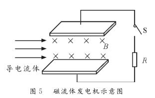 【例1】圖5為磁流體發(fā)電機示意圖。設(shè)兩金屬板間的距離為d,兩極板間勻強磁場的磁感應(yīng)強度為B。等離子體垂直進入磁場的速度為v,單個離子所帶的電荷量為q。離子通道(即兩極板內(nèi)所圍成的空間)的等效電阻為r,負載電阻為R。則下列判斷正確的是( ?。?br /> A。該發(fā)電機的電動勢E=Bdv