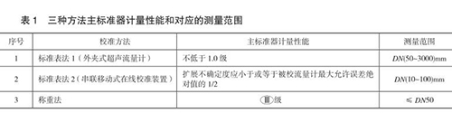 三種方法標(biāo)準(zhǔn)器的測(cè)量范圍應(yīng)覆蓋被校流量計(jì)的測(cè)量范圍。標(biāo)準(zhǔn)表法 1 中,超聲波流量計(jì)在實(shí)驗(yàn)室不同管道口徑和不同管道材質(zhì)標(biāo)定的系數(shù)各不相同,為提高在線(xiàn)校準(zhǔn)準(zhǔn)確度,應(yīng)將超聲流量計(jì)的換能器探頭在實(shí)驗(yàn)室用不同管徑、不同材質(zhì)的管道進(jìn)行流量修正系數(shù)的標(biāo)定,標(biāo)準(zhǔn)表現(xiàn)場(chǎng)使用時(shí)的條件與實(shí)驗(yàn)室溯源的條件應(yīng)保持一致或接近。