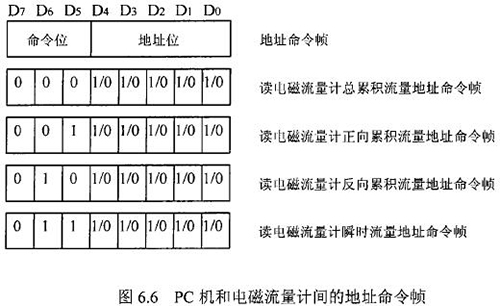 由于RS一485電氣標(biāo)準(zhǔn)規(guī)定每段只能聯(lián)結(jié)犯?jìng)€(gè)節(jié)點(diǎn)設(shè)備,因此可用地址幀中五個(gè)二進(jìn)制位表示這32個(gè)地址,其余3位用來(lái)表示命令,從而構(gòu)成地址命令幀。對(duì)于控制命令需求不超過(guò)八個(gè)的通信系統(tǒng),采用地址命令幀可壓縮報(bào)文長(zhǎng)度提高通信效率。在污水網(wǎng)絡(luò)監(jiān)控系統(tǒng)中,花生油流量計(jì)和PC機(jī)通信的主要目的是將流量計(jì)中的有用數(shù)據(jù)讀到PC機(jī)中。這些數(shù)據(jù)包括:總累積流量、正向累積流量、反向累積流量、瞬時(shí)流量。通信時(shí),PC機(jī)只需向花生油流量計(jì)發(fā)送讀總累積流量、讀正向累積流量、讀反向累積流量、讀瞬時(shí)流量命令即可,因此二者間通信所用的地址幀和命令幀可合二為一,用一個(gè)地址命令幀代替。PC機(jī)和花生油流量計(jì)間的地址命令幀定義如圖.66所示。根據(jù)污水網(wǎng)絡(luò)監(jiān)控系統(tǒng)中PC機(jī)與花生油流量計(jì)間通信的特殊性,二者通信所使用的報(bào)文可簡(jiǎn)化為圖.67的格式。