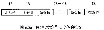 在花生油流量計(jì)等節(jié)點(diǎn)設(shè)備和C機(jī)通信的過(guò)程中,由地址幀、命令幀、數(shù)據(jù)幀、校驗(yàn)和可組成各種功能不同的報(bào)文。由于采用主從工作方式來(lái)實(shí)現(xiàn)通信,花生油流量計(jì)等節(jié)點(diǎn)設(shè)備僅能接收并執(zhí)行PC機(jī)發(fā)送來(lái)的控制命令,而不能發(fā)送命令給PC機(jī)。因此,由PC機(jī)發(fā)往流量計(jì)等節(jié)點(diǎn)設(shè)備的報(bào)文一般包括一個(gè)地址幀,一個(gè)命令幀,若干個(gè)數(shù)據(jù)幀和一個(gè)校驗(yàn)和,其報(bào)文格式圖.6a5所示;而由流量計(jì)等節(jié)點(diǎn)設(shè)備發(fā)往PC機(jī)的報(bào)文一般包括一個(gè)地址幀,若干個(gè)數(shù)據(jù)幀和一個(gè)校驗(yàn)和,其報(bào)文格式如圖6.5b所示。