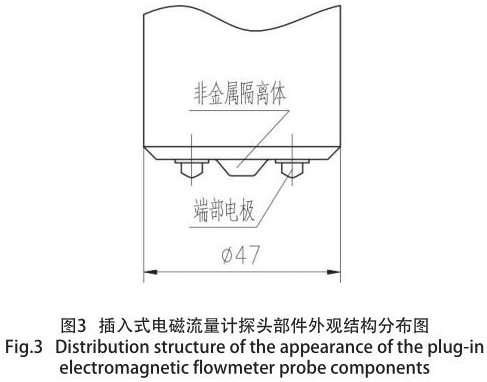 通過大量的試驗(yàn),對(duì)探頭端部外型結(jié)構(gòu)亦采用特殊設(shè)計(jì),從而消除兩個(gè)電極之間的擾流現(xiàn)象,同時(shí)亦消除因通電產(chǎn)生磁場(chǎng),導(dǎo)致兩個(gè)電極吸附介質(zhì)中的鐵屑而影響測(cè)量精度和死區(qū)效應(yīng),增強(qiáng)了輸出信號(hào)的穩(wěn)定性,從而提高傳感器準(zhǔn)確度和抗干擾性。通過結(jié)構(gòu)的優(yōu)化設(shè)計(jì),使用壽命更長(zhǎng),dn80泥漿流量計(jì)探頭局部,如圖 3 所示。