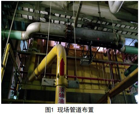 考慮兩臺機組管線布置和運行狀態(tài)完全一致, 下面僅提供#1機組的測量分析。圖1中頂軸油管上 部水平管道為凝結水補水管道。