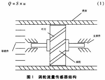渦輪流量傳感器結構如圖1所示,屬于速度式流量傳感器。渦輪置于流體通道中,隨著流體的流動產(chǎn)生旋轉(zhuǎn),設渦輪的轉(zhuǎn)速為n、流過渦輪的流體速度為u,則n與u成正比;流體通道的流通截面.積S是已知的常數(shù),所以,流過渦輪流量傳感器的流體體積流量Q為: