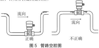測(cè)量流向取決于智能型電磁流量計(jì)的安裝方位,將智能型電磁流量計(jì)在接頭上旋轉(zhuǎn) 180 度即可反向。正流向時(shí),智能型電磁流量計(jì)的突耳應(yīng)在上游方向。流量顯示總是正的,而累加器可以根據(jù)流向增加或者減少。安裝中確認(rèn)管路設(shè)計(jì)不允許在介質(zhì)中產(chǎn)生氣泡或空腔,否則將引起測(cè)量誤差(見(jiàn)圖 5)。