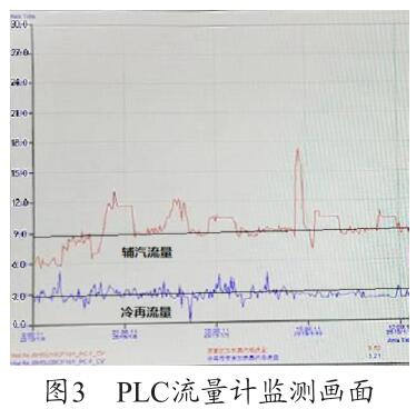 通過圖3可以看出,PLC 上輔汽測量用的氣體流量計的量程設(shè)置為30t/h,現(xiàn)場設(shè)備量程實際為5t/h,兩者嚴(yán)重不符,因此測量值8.286t/h 為錯誤值,需要對程序進(jìn)行修改。