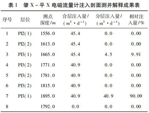 2017 年 9 月在大慶油田采油八廠肇 X - 平 X 水平井注水井中*次進行了水平井注入剖面測井現(xiàn)場試驗。該井斜深2 055. 42 m,水平段長度為568. 46 m,試驗?zāi)康氖峭ㄟ^注入剖面測井了解該井各層段的注水情況,同時對水平井測井工藝、儀器的適用性、井下牽引器及井口輔助裝置等設(shè)備的工作有效性和可靠性進行評價?,F(xiàn)場試驗中,在密閉條件下錄取到了該井的注入剖面測井資料,進行了重復(fù)測量,重復(fù)測量結(jié)果在誤差允許范圍內(nèi),測井成果見表 1。該井施工壓力 6. 0 MPa,注入量45. 4 m3 /d,有 7 個射孔層,分 8 個測點測量,2 個層有吸入顯示,其中,P13( 1) ( 1 734 ~ 1 767 m) 層絕對吸入量4. 5 m3 /d,相對吸入量為9. 91 %,P13( 1) ( 1 899 ~1 943 m)層絕對吸入量 40. 9 m3 /d,相對吸入量為 90. 09% ,測井成果見表 1。通過與甲方的交流,再結(jié)合該井的動靜態(tài)資料及周圍井的工作狀況,采油廠的地質(zhì)人員認(rèn)為本次測井結(jié)果能比較準(zhǔn)確地反映該井的注入情況。