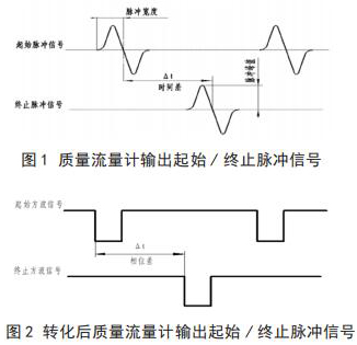 將高壓電磁流量計流量與相關(guān)測試設(shè)備連接起來,就可以進(jìn)行高壓電磁流量計的校準(zhǔn),時間差△ t 由專用試驗測試設(shè)備可以測出。起始脈沖信號和終止脈沖信號如圖 1 所示。經(jīng)過專用試驗測試設(shè)備信號轉(zhuǎn)化后的信號方波如圖 2 所示。