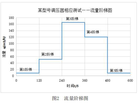 該測試主要利用實驗室測試條件,模擬客戶現(xiàn)場使用情況。其主要測試內(nèi)容包括:測試高溫液體流量計在+23℃,-30℃和-40℃三種溫度下,高溫液體流量計出口壓力分別在2.1kPa和30kPa時,流量分別從*1階梯到*5階梯時的響應(yīng)速度,客戶所提供的流量階梯如圖2所示。橫軸表示下游球閥開啟動作時間,縱軸表示高溫液體流量計下游需要的流量q。