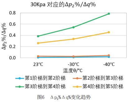為了更直觀嚴(yán)謹(jǐn)?shù)膶Ρ让總€階段響應(yīng)速度的不同,對原始數(shù)據(jù)進(jìn)行處理,得到如下表格2和表格3。將△p2%/△q%作為響應(yīng)速度的直觀量化表達(dá),若△p2%/△q%的值大,說明單位流量變化照成的出口壓力變化大,即說明高溫液體流量計響應(yīng)相對較慢,反之亦然。