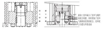 4)優(yōu)化閥桿與閥座的對中性,由于原設(shè)計結(jié)構(gòu),閥桿與閥座的對中性不易保證,此次加工新導(dǎo)向十字套減小了套環(huán)與閥桿的配合間隙,同時增加套環(huán)與操縱座套筒的配合,優(yōu)化后的導(dǎo)向十字套結(jié)構(gòu)自身能夠保證閥桿的定位及對中,如圖3。
