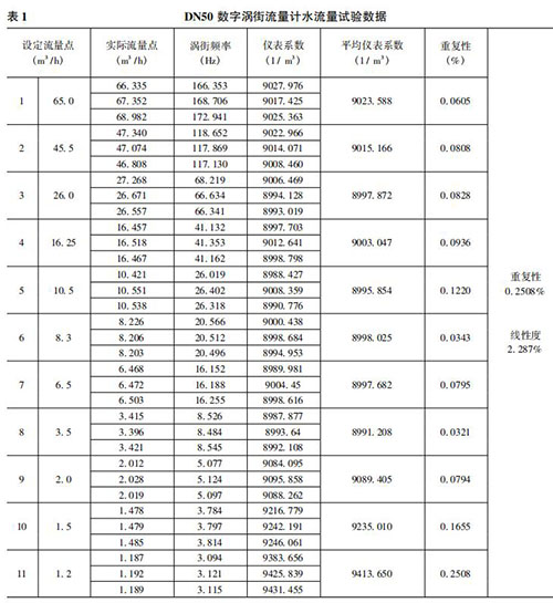 將本文實(shí)現(xiàn)的數(shù)字鍋爐煙氣流量計(jì)在上述 50mm 口 徑( 簡(jiǎn)稱(chēng) DN50) 的水流量試驗(yàn)裝置上進(jìn)行試驗(yàn)。先在其正常流量范圍內(nèi)進(jìn)行試驗(yàn),流量從大到小逐漸降低,之后不斷探求其所能測(cè)量的*小流量。每個(gè)流量點(diǎn)試驗(yàn)三次,計(jì)算其重復(fù)性、平均儀表系數(shù)和線(xiàn)性度。水流量試驗(yàn)數(shù)據(jù)如表 1 所示。