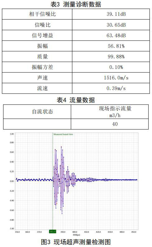 在機(jī)組自流補(bǔ)給水狀態(tài):同樣采用德國(guó)FLUEX 高精度外夾式超聲波流量計(jì)作為標(biāo)準(zhǔn)流量計(jì),測(cè)量 基礎(chǔ)數(shù)據(jù):管道外徑276.93mm,管壁厚度12.40mm, 采用兩聲程169mm傳感器安裝距離,通過(guò)對(duì)超聲波流量計(jì)信號(hào)分析與診斷(數(shù)據(jù)見(jiàn)表3和表4),超聲 波流量計(jì)測(cè)量狀態(tài)符合條件,開(kāi)始測(cè)量,打開(kāi)凝汽 器入口閥門(mén),流量測(cè)量情況如下