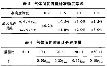 在GB21391--2008《用氣體渦輪流量計測量天然氣流量》對分界流量q,有明確的定義,即低于該流量要采用擴展誤差限的流量值。標準*5.2條從*大允許誤差和量程比兩方面對分界流量做出了規(guī)定,且明確了量程比是在*大允許誤差范圍內(nèi)流量計的*小流量和*大流量之比。該標準中對渦輪流量計要求的*大允許誤差如表1所示,量程比與分界流量q,的關系如表2所示。