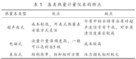 目前供熱行業(yè)內(nèi)使用的熱量計(jì)量?jī)x表按工作原理主要分為超聲波式、 電磁式、 差壓式, 其特點(diǎn)見表 1 。 熱量計(jì)量?jī)x表按結(jié)構(gòu)可分為一體式和分體式, 一體式熱量表將一支入口或出口溫度傳感器嵌入到流量傳感器管道中, 并配有專門的計(jì)算器進(jìn)行熱量計(jì)算; 分體式熱量表采用單獨(dú)的流量傳感器, 包括超聲波流量計(jì)、 電磁流量計(jì)、 差壓流量計(jì)、瀝青流量計(jì)等, 溫度測(cè)量采用單獨(dú)的鉑電阻溫度計(jì)或溫度變送器測(cè)量供回水管道溫度, 再配備熱量積算儀進(jìn)行溫度和流量信號(hào)采集得到熱量值。