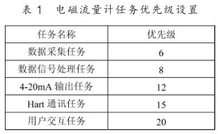 下面以電磁流量計(jì)為例說明基于 μC/OS-III 的人機(jī)界面設(shè)計(jì)。 先將 μC/OS-III 移植到 Cortex-M3 處理器上,這里選用的是 STM32F103VET6 。電磁流量計(jì)的應(yīng)用程序若按照上節(jié)的任務(wù)種類劃分有: 數(shù)據(jù)采集任務(wù)、數(shù)據(jù)處理任務(wù), 4~20mA輸出任務(wù), Hart 通訊任務(wù)以及用戶交互任務(wù)。 先對(duì)不同的任務(wù)進(jìn)行優(yōu)先級(jí)的劃分,如表 1 所示。