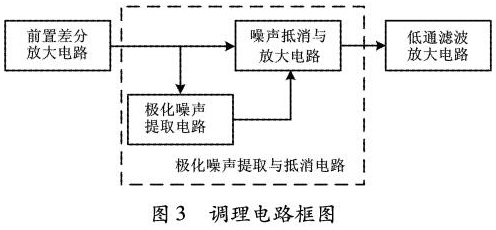 根據(jù)前饋控制的自適應(yīng)極化噪聲抵消原理,設(shè)計(jì)了信號調(diào)理電路2,以實(shí)現(xiàn)極化噪聲的濾除。信號調(diào)理電路2主要包括前置差分放大電路、極化噪聲提取與抵消電路、低通濾波放大電路三部分。調(diào)理電路如圖3所示。