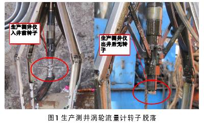 測井儀底部氣體渦輪流量計(jì)在四上四下測井任務(wù)中轉(zhuǎn)速過快,地面直讀顯示該轉(zhuǎn)子的*高轉(zhuǎn)速達(dá)到260rps,超過了轉(zhuǎn)子的安全工作轉(zhuǎn)速.上限200rps,同時(shí)需長時(shí)間滯留在產(chǎn)層位置進(jìn)行流壓測試操作,因此直接原因?yàn)檗D(zhuǎn)子在高溫高流速的極限工作環(huán)境下發(fā)生脫落,影響了測井?dāng)?shù)據(jù)的錄取,如圖1所示。