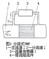 為了獲得良好的線(xiàn)形輸出,必須保持層流流動(dòng),測(cè)量管內(nèi)徑d設(shè)計(jì)得很小而長(zhǎng)度l很長(zhǎng),即有很大l/d比值,流速低,流量小。為擴(kuò)大儀表流量,還可采用在管道內(nèi)裝管束等層流阻流件;擴(kuò)大更大流量和口徑還常采用分流方式,在主管道內(nèi)裝層流阻流件(見(jiàn)圖3)以恒定比值分流部分流體到流量傳感部件。有些型號(hào)儀表也有用文丘里噴嘴等代替層流阻流件。